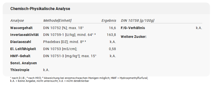 Bei der chemisch-physikalischen Analyse wird der Honig gezielt auf bestimmte Inhaltsstoffe getestet, darunter der Wassergehalt, die elektrische Leitfähigkeit und die Enzymaktivität. Diese Ergebnisse geben Aufschluss über die Qualität des Honigs.