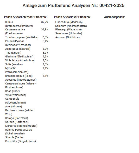 Dass 37,7 % der Pollen von Brombeeren und Himbeeren stammen, war keine Überraschung. Rund um das Areal wachsen zahlreiche Brombeersträucher, und in den Sommermonaten konnten wir dort ein reges Brummen und Summen beobachten. Unerwartet hoch war hingegen der Anteil der Edelkastanie mit 31,9 %. Offenbar sind die Bienen hierfür in den nahegelegenen Wald geflogen. Einen größeren Bestand an Edelkastanien hatten wir dort selbst bisher nicht wahrgenommen. In der kommenden Saison werden wir diesem Aspekt auf jeden Fall mehr Aufmerksamkeit schenken. Ebenso überraschend war für uns der geringe Anteil der Ackerbohne mit nur 1,3 %. Unsere Bienenvölker standen direkt an einem Winterackerbohnenfeld. Teilweise konnte man beobachten, wie die Bienen den Stock verließen, nur wenige Meter flogen und sich unmittelbar auf den Blüten der Winterackerbohne niederließen. Hier haben wir mit einen höheren Anteil gerechnet.