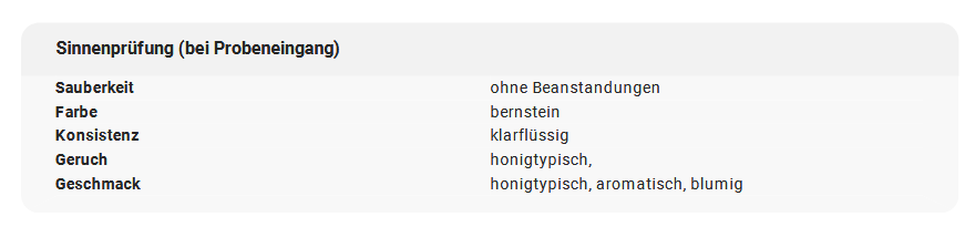Unser Honig ist bernsteinfarben, klarflüssig, aromatisch, blumig und selbstverständlich sauber. Bei etikettierten Honigen wird überprüft, ob alle erforderlichen Angaben gemäß den lebensmittelrechtlichen Vorschriften vorhanden und korrekt angegeben sind. Auch diese Angaben sind bei uns ohne Beanstandung.